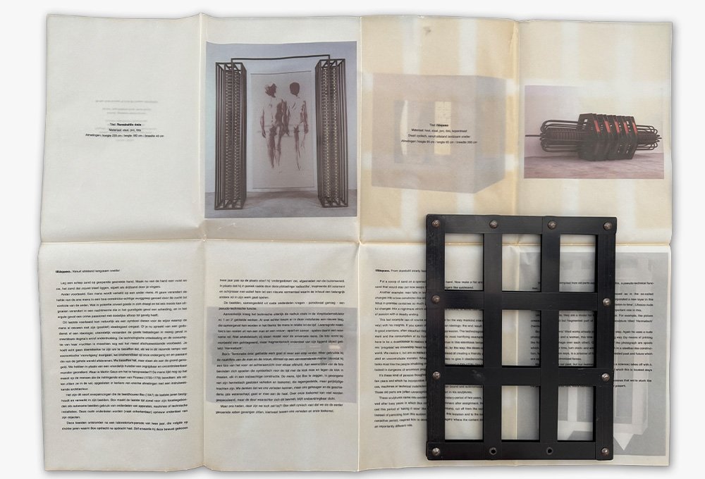 Dit kunstenaarsboek van Dik Box is zowel een kunstobject als een boek. De omslag, opgebouwd uit een raster van zwart metaal en nietjes, roept associaties op met een traliewerk of constructief frame. Het woord "BOX" staat centraal en verwijst zowel naar de maker als naar thema’s als opsluiting en begrenzing. Achter het raster bevinden zich gelaagde teksten en beelden, gedrukt op grootformaat, semi-transparant papier — deels zichtbaar, deels verborgen — wat uitnodigt tot reflectie op openheid, controle en interpretatie.